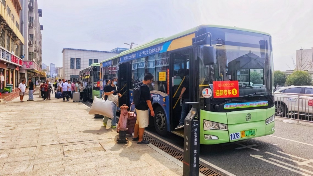 9月6日早上6點00分,市公交集團將掛有“迎新專車”牌子的定制專車車隊,整齊地??吭诨疖囌颈睆V場進行等待。