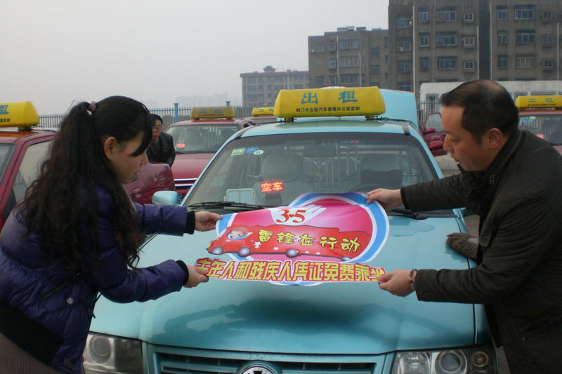 昨日7時30分,市出租汽車公司雷鋒車隊的20臺雷鋒車和20臺優(yōu)秀出租汽車匯集到泉口一路市出租汽車公司院內(nèi),統(tǒng)一粘貼心形的"3-5雷鋒在行動""老年人和殘疾人免費乘坐"活動標(biāo)識(如圖),經(jīng)過簡短的啟動儀式后,駕駛員們整裝出發(fā),在城區(qū)運(yùn)行,對老年人、殘疾人和到醫(yī)院就醫(yī)但行動不便的病人實行免費接送服務(wù)。