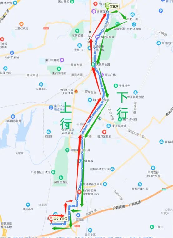 上行線路走向?yàn)椋焊A?鳳凰五路-創(chuàng)業(yè)四路-科技園路-創(chuàng)業(yè)二路-興隆大道-虎牙關(guān)大道-白云大道-文化宮。