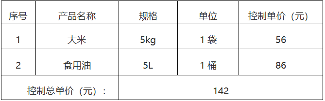 預(yù)算金額:本次詢(xún)價(jià)對(duì)大米、食用油的單價(jià)、合計(jì)總單價(jià)進(jìn)行詢(xún)價(jià),在各分類(lèi)報(bào)價(jià)不超過(guò)控制單價(jià)(含稅)的前提下,控制總單價(jià)142元,超過(guò)此采購(gòu)預(yù)算的報(bào)價(jià)無(wú)效。